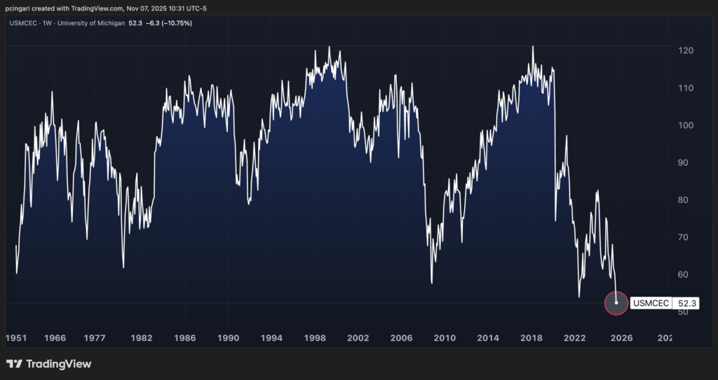 소비자 신뢰지수 50.3으로 하락—역대 최저 수준 중 하나