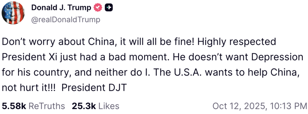트럼프 대통령은 일요일 트루스소셜에 “중국에 대해 걱정하지 마라. 모든 것이 잘 될 것이다”라고 게시하며 “존경받는 시진핑 주석에게 잠시 안 좋은 순간이 있었을 뿐”이라며 긴장 완화를 암시했다.