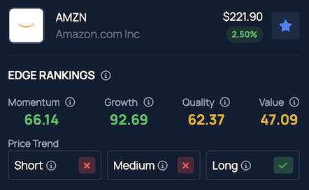 벤징가 엣지 주식 랭킹에 따르면 AMZN은 단기 및 중기 성과가 부진함에도 장기적으로 견고한 주가 추세를 보이고 있다.