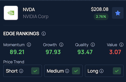 엔비디아 주가는 수요일 1.75% 하락했으나 애프터마켓에서 0.56% 상승했다. 벤징가의 엣지 주식 랭킹은 엔비디아의 강력한 모멘텀, 성장성 및 질적 우위를 강조하며, 단기·중기·장기 시간대 전반에 걸쳐 지속적인 상승 추세를 보여주고 있다.