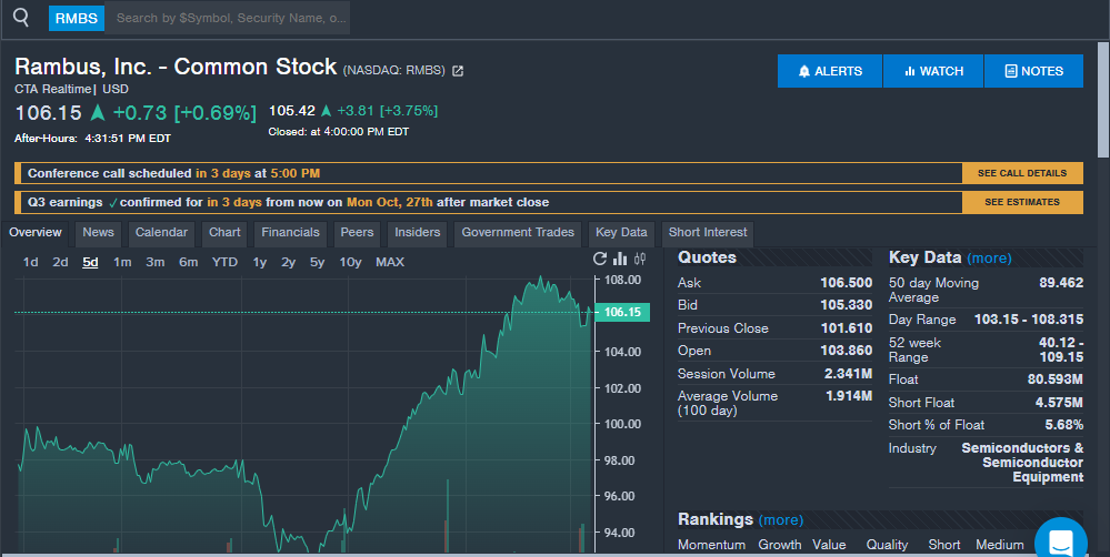 이 반도체 회사의 주가는 무려 25년 만에 최고가에 도달했다. 회사는 10월 27일(월)에 3분기 재무 실적을 보고할 예정이다. 애널리스트들은 회사가 주당 63센트의 이익을 보고할 것으로 기대하는데, 이는 지난해 3분기 주당 51센트보다 상승한 수치이다. 애널리스트들은 또한 램버스가 분기 매출 1억 7,543만 달러를 보고할 것으로 예상했으며, 지난해 3분기 1억 4,677만 달러였던 것에 비해 상승한 수치이다. 램버스는 최근 3개 분기 연속으로 애널리스트들의 주당순이익 추정치를 뛰어넘었으며, 전반적으로 지난 10개 분기 중 7개 분기에서 이 같은 성과를 냈다. 램버스는 최근 3개 분기 연속으로 애널리스트들의 매출 추정치를 뛰어넘었으며, 전반적으로 지난 10개 분기 중 5개 분기에서 이를 달성했다. 램버스는 2분기에 사상 최고 규모의 제품 매출을 기록했으며, 만약 또 다른 사상 최고 분기 매출을 기록한다면 회사에 더욱 주목할 수 있을 것이다.