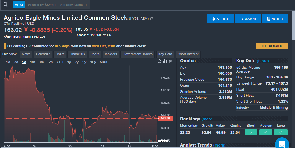 이 금 광산 회사의 주가는 2025년 현재 거의 100% 상승했다. 회사는 10월 29일(수)에 3분기 재무 실적을 보고할 예정이며, 이는 강력한 연도의 또 다른 촉매제가 될 수 있다. 애널리스트들은 회사가 주당 1.82달러의 이익을 보고할 것으로 예상하는데, 이는 지난해 3분기 주당 1.14달러에서 상승한 수치이다. 아그니코 이글 마인스는 최근 7개 분기 연속으로, 그리고 전체적으로 지난 10개 분기 중 8개 분기에서 애널리스트 추정치를 뛰어넘는 실적을 기록했다. 애널리스트들은 회사가 매출 28억 8천만 달러를 보고할 것으로 기대했는데, 이는 지난해 3분기 21억 6천만 달러였던 것에 비해 상승한 수치이다. 아그니코 이글 마인스는 최근 2개 분기 연속으로, 그리고 전반적으로 지난 10개 분기 중 7개 분기에서 애널리스트들의 매출 추정치를 뛰어넘는 실적을 기록했다. 애널리스트들은 이번 분기 실적 발표에 앞서 이 종목의 목표주가를 인상했다.
