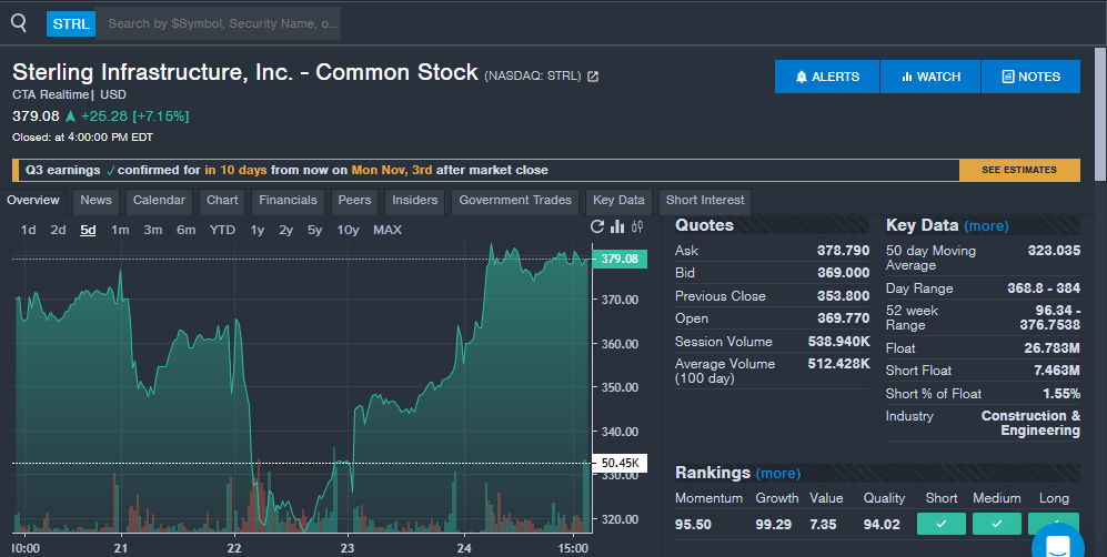 이 인프라 회사는 지난주 동안 독자들의 큰 관심을 받았으며, 이는 11월 3일에 발표될 3분기 재무 실적에 앞서 낙관론이 제기되었음을 알 수 있다. 이 회사는 2분기에 사상 최고 실적을 보고했으며, 가이던스 수치를 높였고 또 다른 강력한 분기 실적을 기록하기 위해 노력하고 있다. 스털링 인프라스트럭처는 최근 9개 분기 연속으로 애널리스트들의 주당순이익 추정치를 뛰어넘었으며, 2개 분기 연속으로 애널리스트들의 매출 추정치도 뛰어넘었다. 애널리스트들은 지난해 3분기 주당 1.97달러의 주당순이익이 올해 3분기에는 주당 2.48달러까지 상승할 것으로 전망했으며, 매출액은 5억 9,374만 달러에서 6억 2,127만 달러까지 상승할 것으로 예상했다. 이 회사의 주가는 사상 최고가 근처에서 거래되고 있으며 2025년 현재 100% 이상 상승했다.