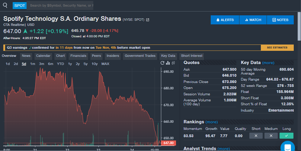 이 엔터테인먼트 및 스트리밍 회사는 독자들의 큰 관심을 받았으며, 이 회사의 주가는 지난주 동안 3% 이상 하락했다. 회사는 11월 4일에 3분기 재무 실적을 보고할 예정이다. 애널리스트들은 이 분기 주당순이익이 1.85달러, 매출이 48억 9천만 달러로 각각 성장할 것으로 기대하며, 이는 지난해 3분기 주당순이익 1.59달러, 매출 43억 8천만 달러에 비해 상승한 수치이다. 이 회사는 최근 4개 분기 연속으로, 그리고 전체적으로 지난 10개 분기 중 7개 분기에서 애널리스트들의 주당순이익 추정치를 밑도는 실적을 기록했다. 이 회사는 전체적으로 지난 10개 분기 중 5개 분기에서 애널리스트들의 매출 추정치를 밑도는 실적을 기록했다. JP모건의 더그 안무스 애널리스트는 최근이 종목의 목표주가를 740달러에서 805달러로 상향 조정하면서 오버웨이트(Overweight) 등급을 유지했다. 이 애널리스트는 강력한 가입자 모멘텀, 가격 인상 및 제품 업그레이드가 이번 분기 및 향후 분기에서 매출과 마진을 끌어올릴 것으로 전망하고 있다. 이 회사의 분기별 실적은 스포티파이의 공동 설립자이자 CEO인 다니엘 에크(Daniel Ek)가 사임을 발표한 후 나오게 된다. 스포티파이는 새로운 리더십과 새로운 제품 업데이트로 회사의 미래가 어떻게 될지에 대한 자세한 내용을 제공할 수 있을 것이다.