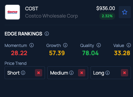 벤징가의 Edge 주식 순위는 코스트코 주식이 22번째 백분위수에 모멘텀을 가지고 있음을 나타낸다. 다른 지표에서 주식의 가치를 확인해 보자.