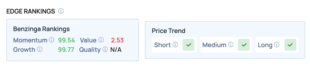 벤징가 엣지 주식 랭킹: 아이렌은 각각 99.54와 99.77이라는 탁월한 모멘텀 및 성장 점수를 기록했으며, 모든 시간대에서의 가격 추세가 긍정적이다.