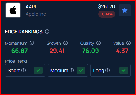 벤징가 엣지 주식 랭킹에 따르면, 애플은 모멘텀 점수 66.87, 품질 점수 76.09를 기록하고 있다.