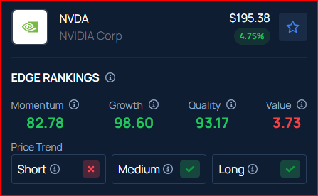 벤징가 엣지 랭킹은 엔비디아의 품질을 93점, 성장성을 98점으로 평가하여 두 분야에서 강력한 성과를 반영했다.