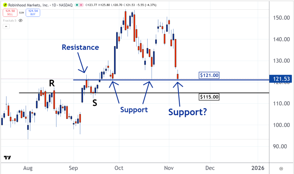 이제 로빈후드는 다시 중요한 $121 수준으로 떨어졌다. 여기서 다시 지지선을 찾으면, 반전하고 상승할 수 있다.