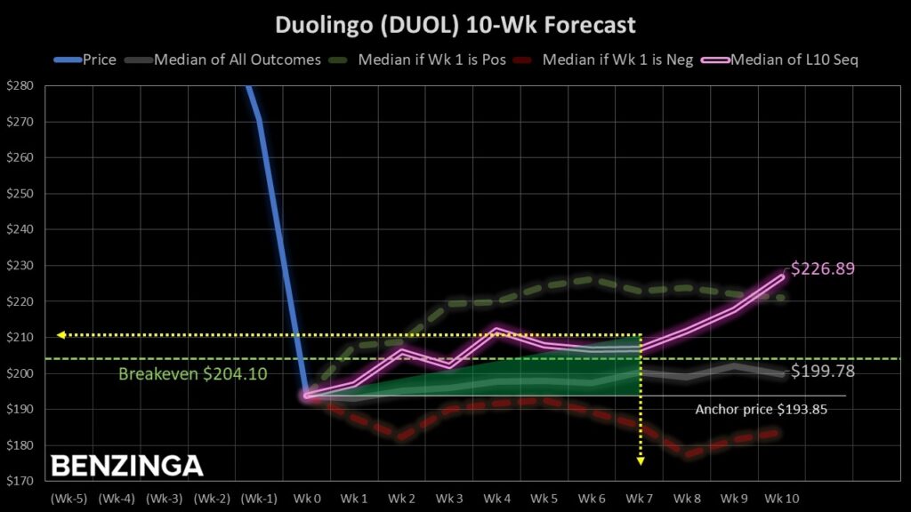 러시아 공리를 사용하여, 우리는 DUOL 주식의 향후 10주간 중간 수익률을 분포 곡선으로 배열할 수 있으며, 결과는 $187.50에서 $207.50 사이로 범위가 설정된다 (기준 가격을 $193.85로 가정). 또한, 가격 클러스터링은 주로 $198 근처에서 발생할 것으로 예상된다.