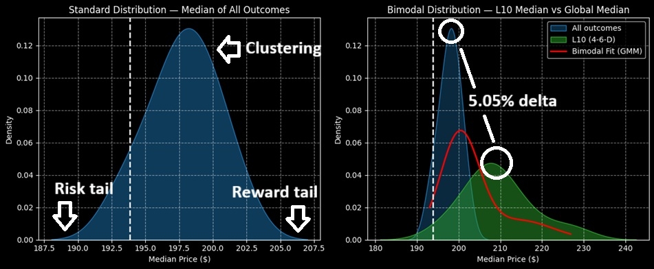 중요하게도, 손익분기점 가격은 $204.10에 도달한다. 4-6-D 조건 하에서 — 그리고 정서 체제가 유지될 것으로 가정하면 — 이것은 현실적인 목표이다. 또한, $210에 도달하는 것은 가능한 결과의 전체 분포 내에 있다.