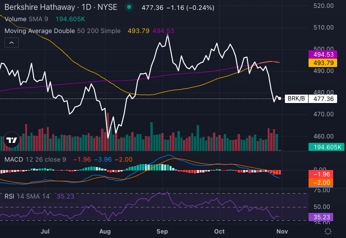 주가의 50일 이동평균선이 200일 이동평균선 아래로 내려가면서 나타나는 이 패턴이 버크셔 해서웨이 클래스 B주에 다시 나타났다. 이는 2025년 8월 이후 처음으로, 당시에도 같은 신호가 상승세 직전에 정확히 나타났다.