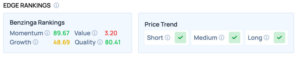 벤징가 엣지 랭킹에 따르면 테슬라는 모멘텀과 품질 지표에서 우수한 성적을 보이며 만족스러운 성장성을 제공하지만, 가치 점수는 부진하다. 또한 테슬라는 단기, 중기, 장기 모두 유리한 가격 추세를 보이고 있다.