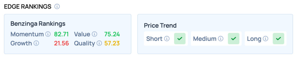 벤징가 엣지 랭킹에서 GM은 모멘텀과 가치 지표에서 우수한 성적을 보이며, 성장성은 낮지만 품질은 만족스러운 수준이다. 또한 단기, 중기, 장기 모두 유리한 가격 추세를 자랑한다.