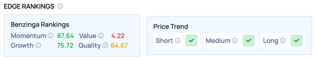 벤징가 엣지 주식 랭킹에 따르면 테슬라는 모멘텀과 성장 지표에서 우수한 성적을 기록했으며, 품질은 양호한 수준이지만 가치는 낮은 편이다. 또한 단기·중기·장기 가격 추세 모두 긍정적이다.
