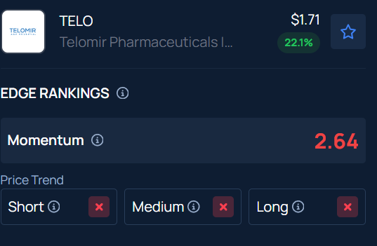 텔로미르 파마슈티컬스(NASDAQ:TELO)의 주가는 월요일 시장 마감 후 시간외 거래에서 38.71% 급등해 1.97달러를 기록했다. 이는 회사가 주력 화합물인 텔로미르-1(Telomir-1)에 대해 유망한 전임상 연구 결과를 발표한 이후 투자자들의 관심이 몰린 데 따른 것이다.