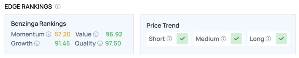 벤징가 엣지 랭킹에 따르면 토요타는 만족스러운 모멘텀을 제공하며 가치, 성장, 품질 지표에서 우수한 점수를 기록하고 있다. 또한 단기, 중기, 장기적으로 유리한 가격 추세를 자랑한다.