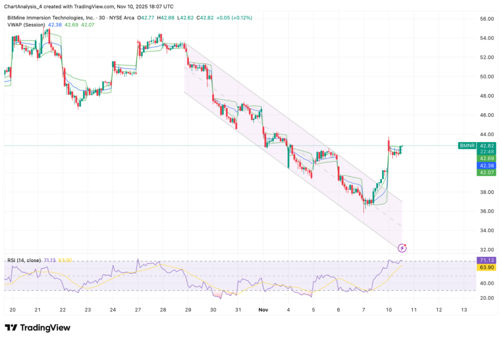 BMNR 가격은 현재 VWAP 바로 위에서 통합되고 있으며, 이는 매수자들이 통제권을 유지할 의사가 있음을 시사한다.