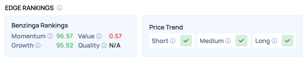 벤징가 엣지 랭킹: PLTR 주식은 96.97이라는 매우 높은 모멘텀 점수를 나타내며 이는 매우 강력한 상승 추세를 보이고 있음을 시사한다.
