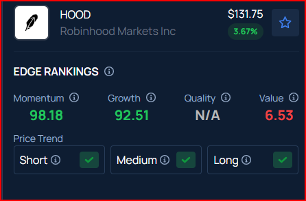벤징가 엣지 랭킹에서 로빈후드의 모멘텀 점수는 99, 성장 점수는 93으로 강력한 성과를 나타낸다. 그러나 가치 점수는 6에 불과하다.