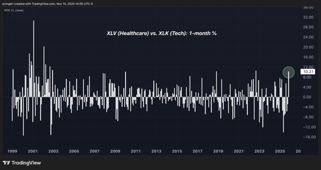 과거 ETF 수익률 데이터에 따르면, 이러한 차이는 현재 2002년 이후 헬스케어와 기술 간의 가장 큰 월간 성과 격차 중 하나로 나타나고 있다.