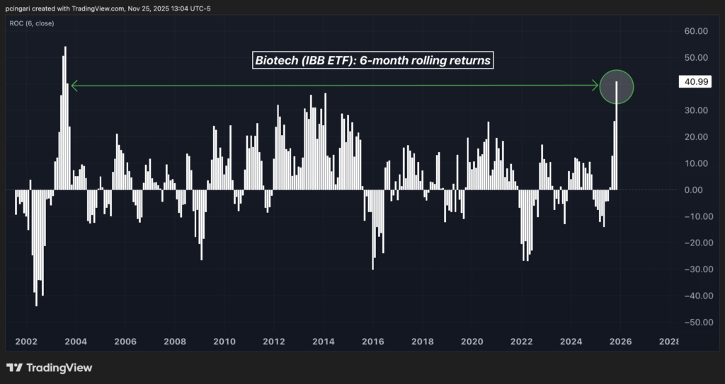 해당 기간 동안 이 부문은 40% 상승하여 2003년 9월 이후 바이오테크의 최고 6개월 누적 수익률을 기록했다.