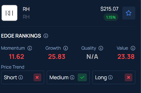 벤징가 엣지 주식 랭킹에 따르면 RH 주가는 중기적으로 상승 추세를 보이고 있다.