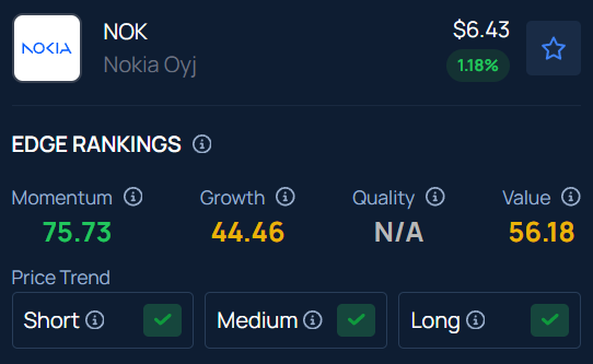 벤징가 엣지 랭킹에서 노키아 모멘텀 점수는 75점이며, 모든 시간대에서 긍정적인 가격 추세를 보이고 있다.