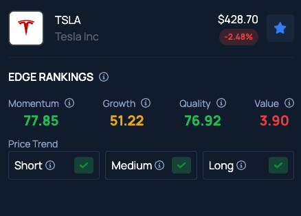 벤징가 엣지 주식 랭킹에 따르면 테슬라의 성장 점수는 51점이다.