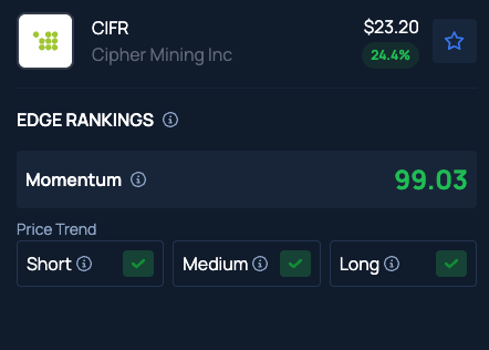 벤징가 엣지 주식 랭킹에 따르면 사이퍼 마이닝 주식은 단기, 중기, 장기 가격 추세에서 모두 긍정적인 평가를 받았다.